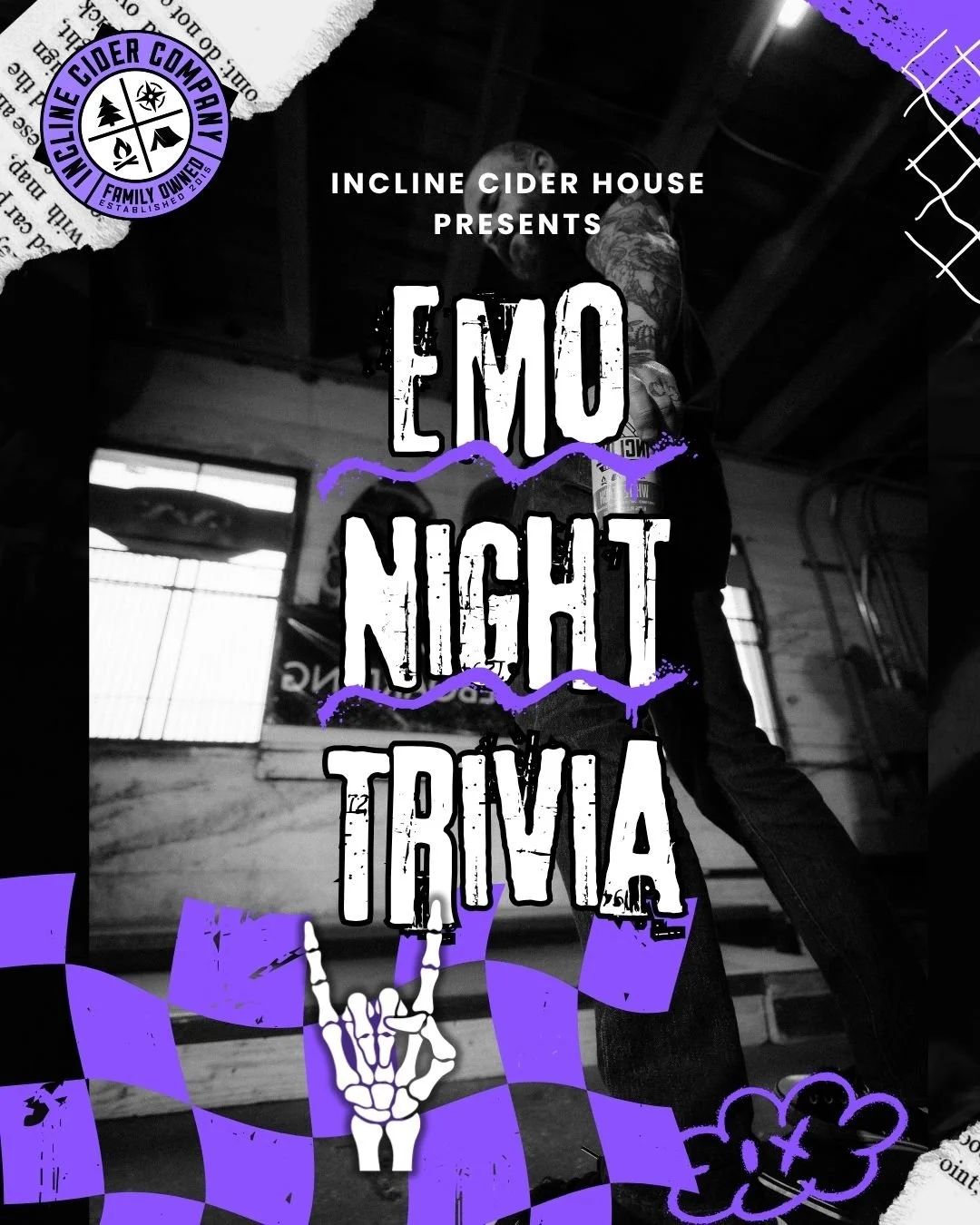 Get angsty, dive into all your pop-punk favorite & dust of those checkered vans. Emo vibes are taking over Incline Cider House for 🖤 EMO NIGHT TRIVIA 🖤