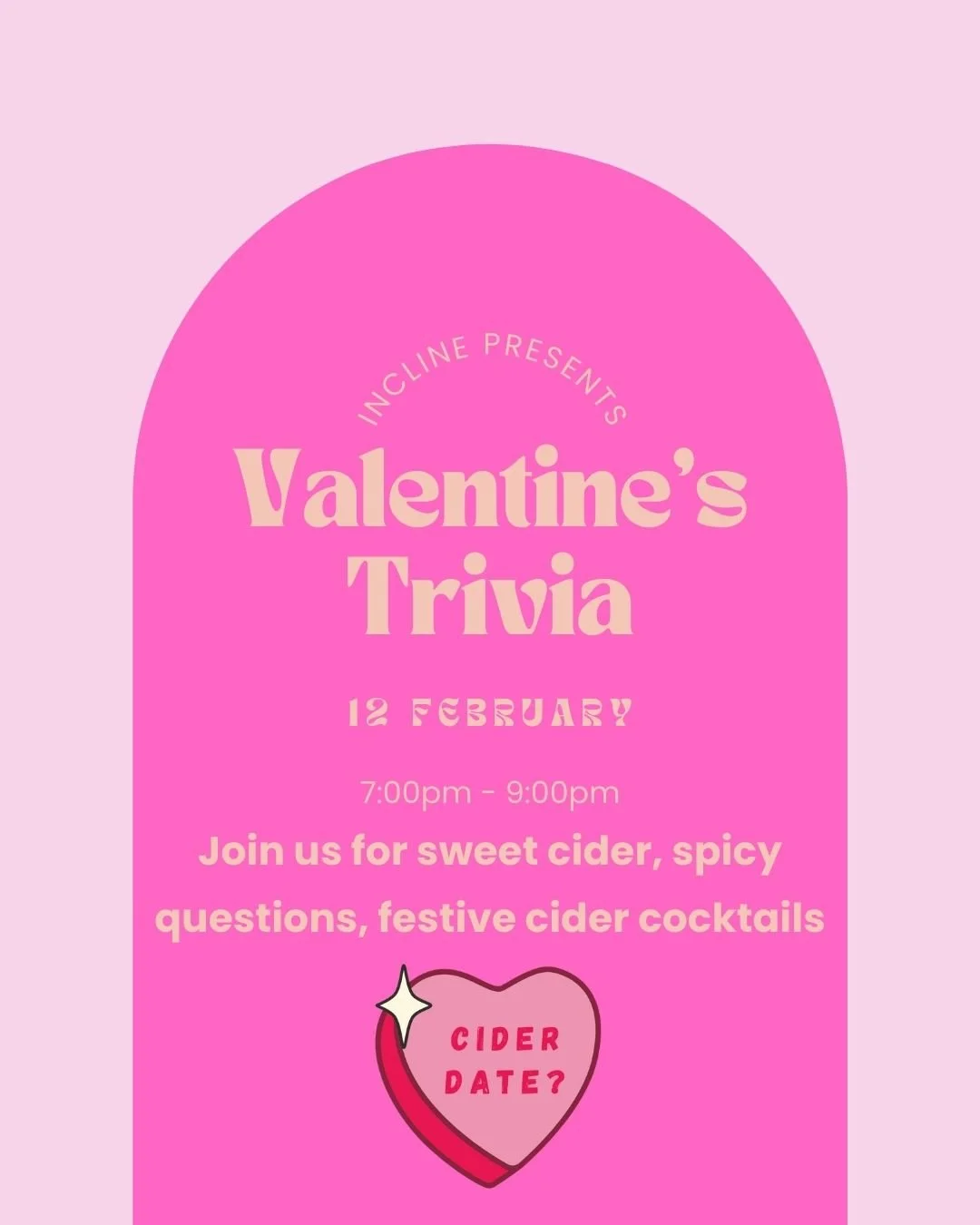 Thursday 2/1w, we're celebrating Valentine's eve with taproom trivia & a totally on theme tap-list. Valentine’s Day Slushies, lots of fun decor, and fully on-theme night at the taproom! Not to mention - our INCLINE CIDER x MAEVE Chocolate Pairing will be in full swing!