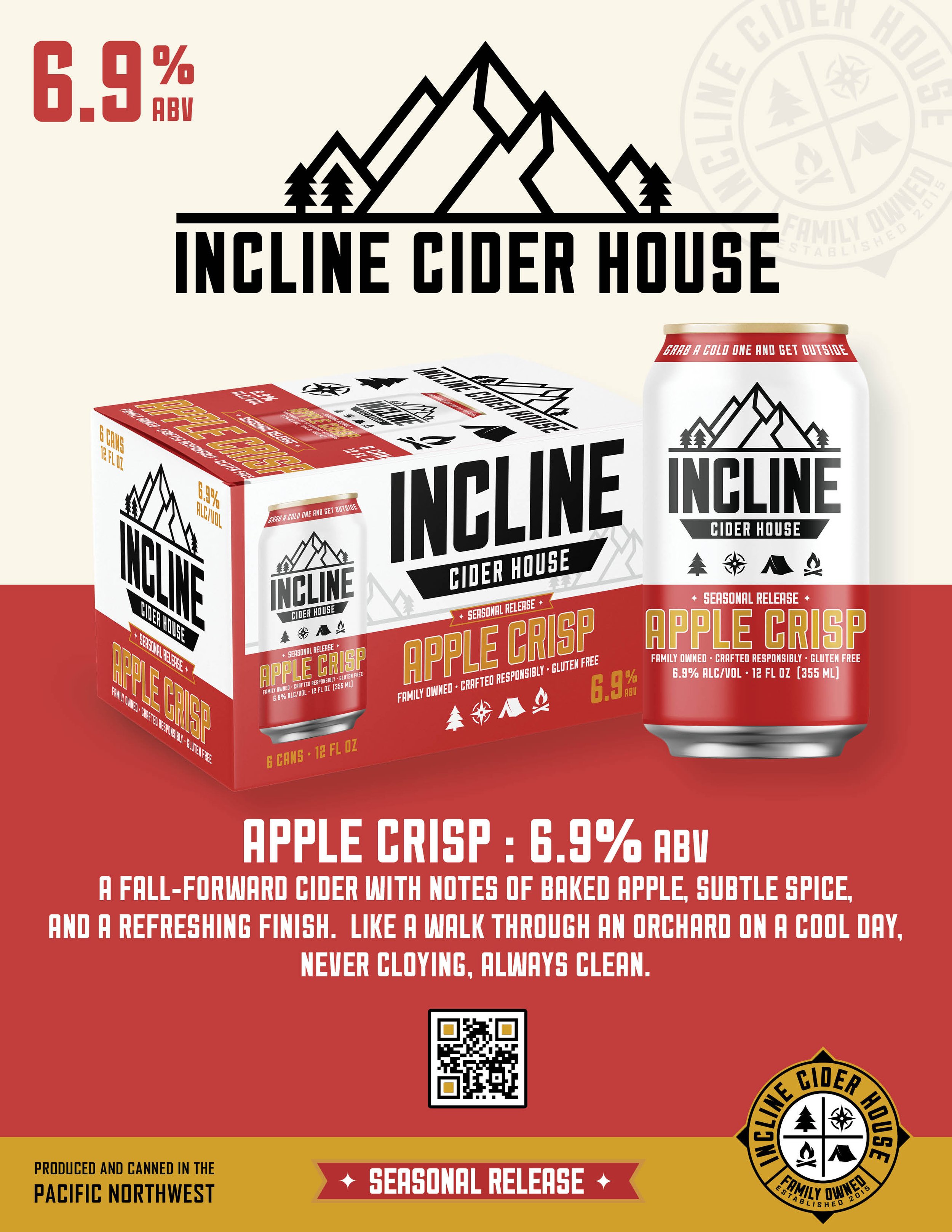 A fall-forward cider with notes of baked apple, subtle spice, and a refreshing finish. Like a walk through an orchard on a cool day, never cloying, always clean.