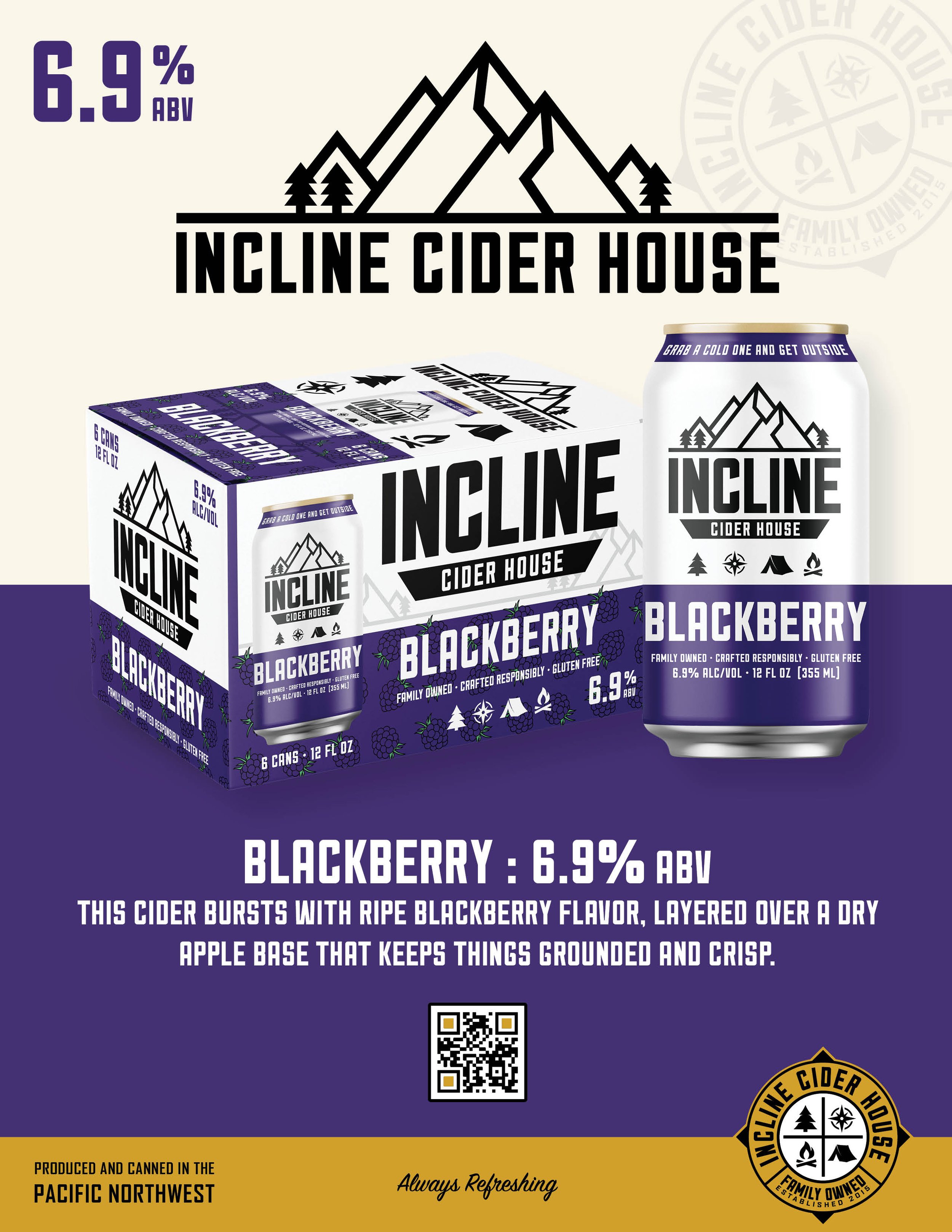 This cider bursts with ripe blackberry flavor, layered over a dry apple base that keeps things grounded and crisp.
