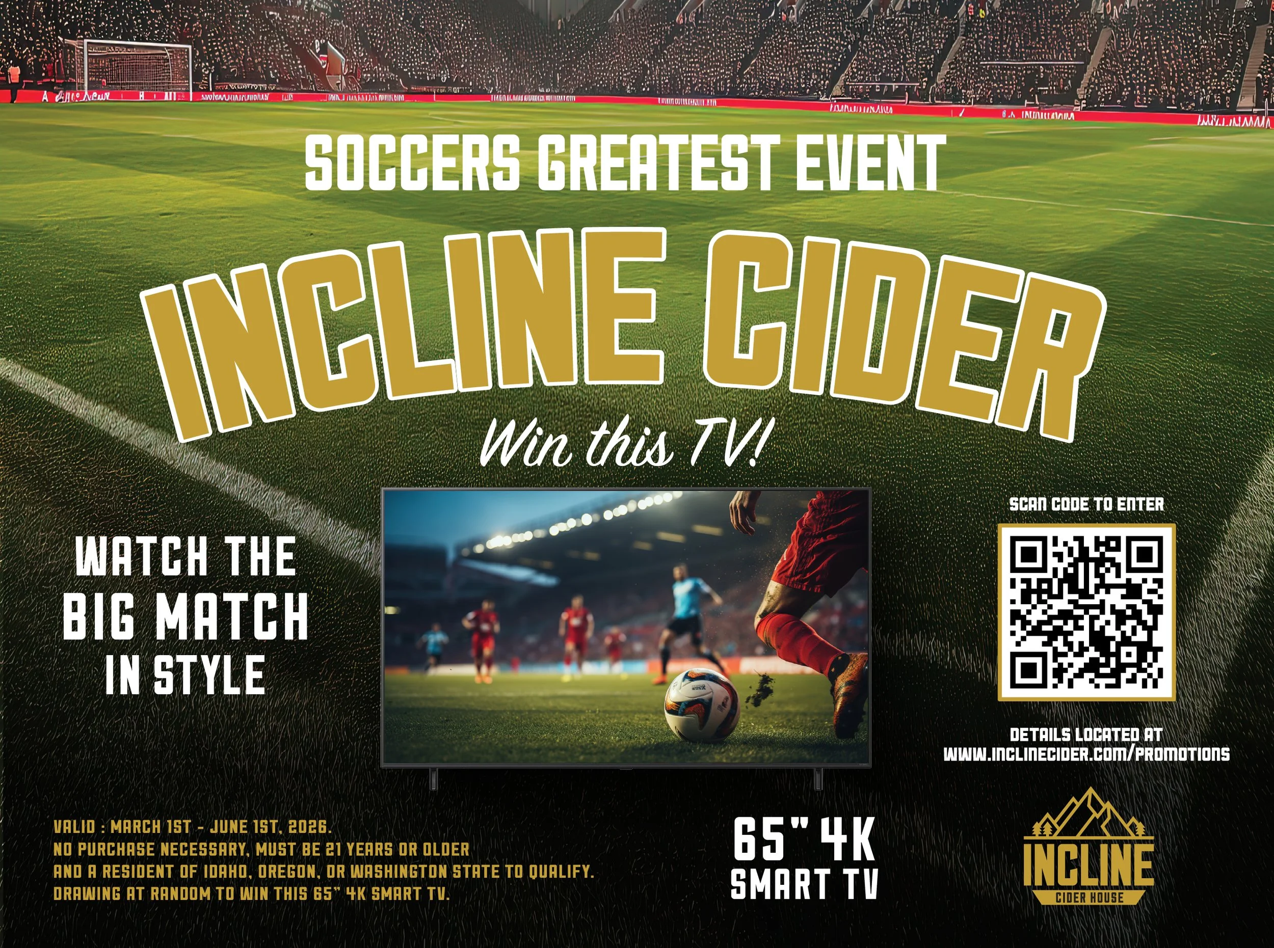 Prize. One 65” 4K Flatscreen TV + Incline Cider Bundle. Sponsor may substitute a prize of equal or greater value at its sole discretion ($1000).